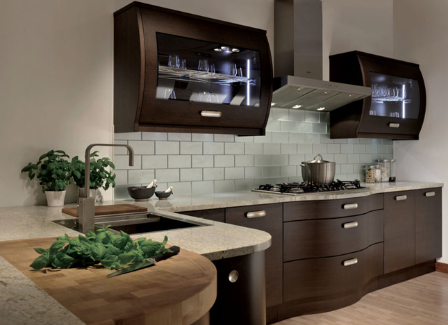 Izari´s rich, subtle-textured wenge gives a premium feel. This is a kitchen for true lovers of design. It's not all about aesthetics though. The curved units not only create a dramatic focal point, they're very ergonomic to work around. The island is full of functional features, including a built-in knife block, butcher´s block and bin on the preparation space, as well as plenty of storage and a lower-level seating area. A mid-level height unit next to the hob gives you the option of built-in, higher-level appliances or larder storage. While the unusual, curved wall units are another example of Izari's design-conscious detailing.